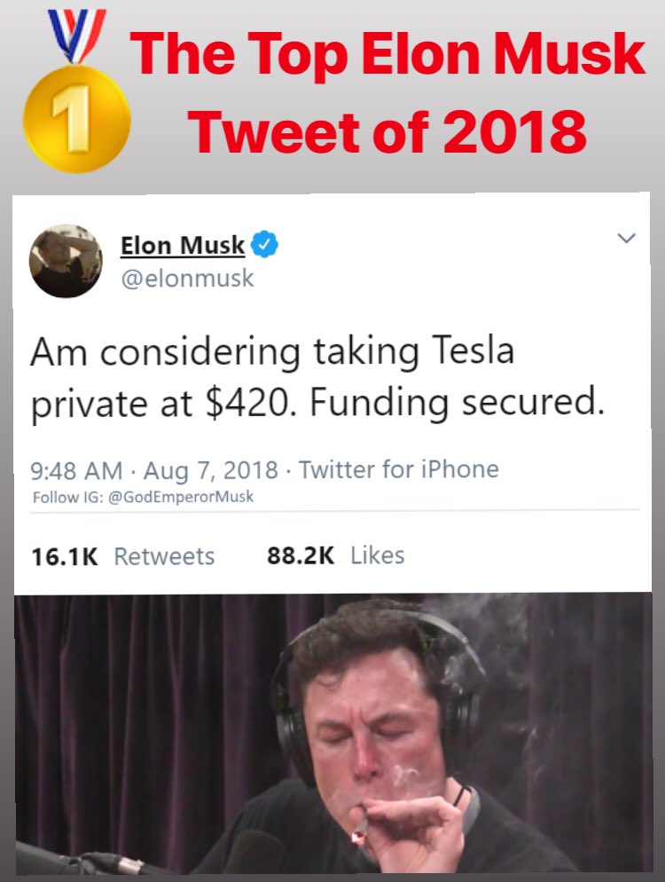 הודעת הטוויטר המפתיעה של המיליארדר ב-7 באוגוסט 2018, בה נכתב: "אני שוקל להפוך את טסלה לפרטית. המימון מובטח", הזניקה את מחיר המניה ליותר מ-13%. ב-24 באוגוסט 2018 כי טסלה תישאר ציבורית, כעת הם מחפשים את עדות המפתח