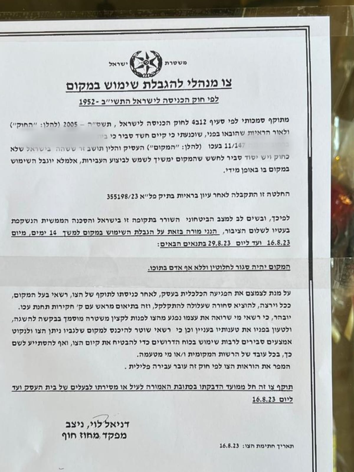 בתוך כך, מטעמים של שלום הציבור, חתם אתמול, מפקד מחוז חוף, ניצב דני לוי, על צו סגירה מנהלי למקום למשך 14 ימים עפ״י חוק הכניסה לישראל. חטיבת התביעות של משטרת ישראל תגיש הבוקר כתב אישום ובקשה למעצרו עד תום ההליכים לבית המשפט השלום בעכו.