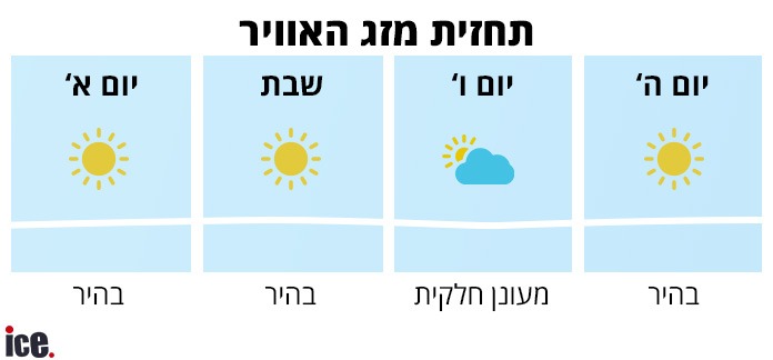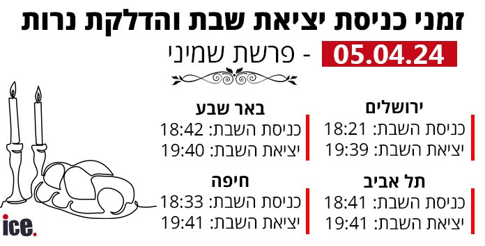 על רקע מלחמת 'חרבות ברזל', רגע לפני שהשבת נכנסת, ice עושה לכם סדר, כמדי שבוע, בזמני כניסת ויציאת שבת והדלקת נרות. והשבוע, פרשת השבוע "שמיני" יום שישי של ה-5.4.2024 עד מוצאי שבת ב-6.4.2024 וגם: מה מזג האוויר הצפוי לסוף השבוע?