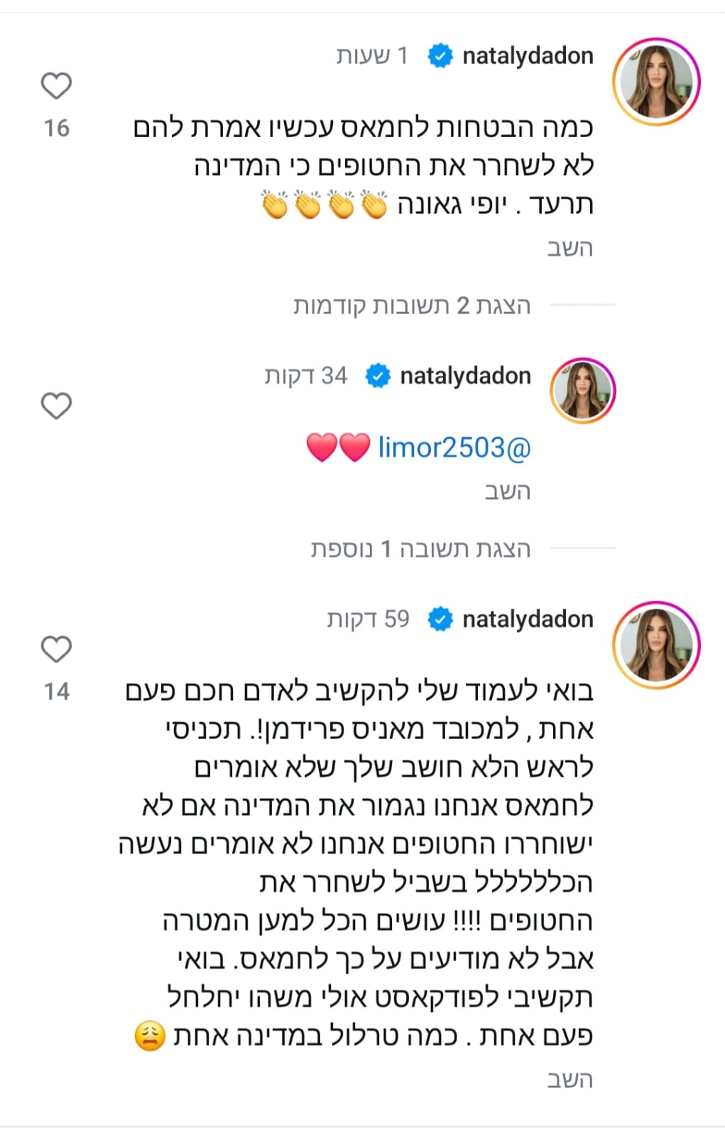 מי שלא אהבה, בלשון המעטה, את דבריה של בן ארי היא נטלי דדון, שלקחה על עצמה לחבוש פאות רק לאחרונה. הדוגמנית לשעבר כתבה בתגובה: "כמה הבטחות לחמאס. עכשיו אמרת להם לא לשחרר את החטופים כי המדינה תרעד, יופי גאונה". לאחר מכן הוסיפה תגובה נוספת: "תכניסי לראש הלא חושב שלך, שלא אומרים לחמאס אנחנו נגמור את המדינה אם לא ישוחררו החטופים. אנחנו לא אומרים נעשה הכל בשביל לשחרר את החטופים! עושים הכל למען המטרה אבל לא מודיעים על כך לחמאס", לסיום הזמינה את חברת הכנסת להקשיב לפודקאסט שלה בנושא: "אולי משהו יחלחל פעם אחת. כמה טרלול במדינה אחת".