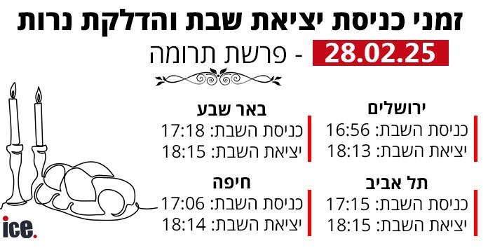 עכשיו כשמלחמת חרבות ברזל הגיעה לסיומה, רגע לפני שהשבת נכנסת, ice עושה לכם סדר, כמדי שבוע, בזמני כניסת ויציאת שבת והדלקת נרות. והשבוע, פרשת השבוע "תרומה" יום שישי של ה-28.2.2025 עד מוצאי שבת ב-1.3.2025. וגם: מה מזג האוויר הצפוי לסוף השבוע?