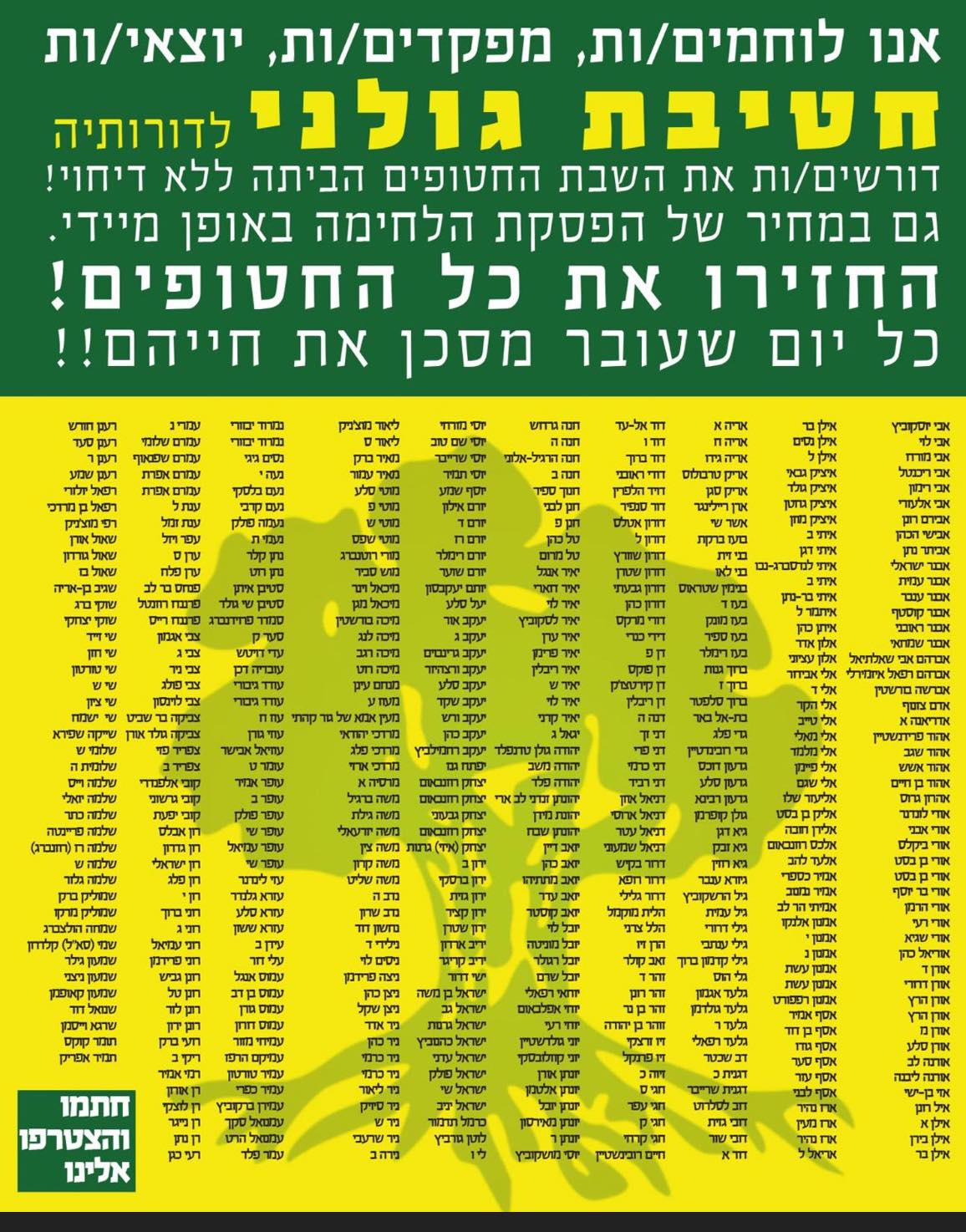 עוד נכתב: "זו המשימה הראשונה במעלה, אלה הערכים לאורם אנו פועלים וזו חובתנו המוסרית כאומה. זו קריאה להצלת חיים. כל רגע נוסף של הססנות מסכן את חייהם. את כולם.ן הביתה עכשיו!".