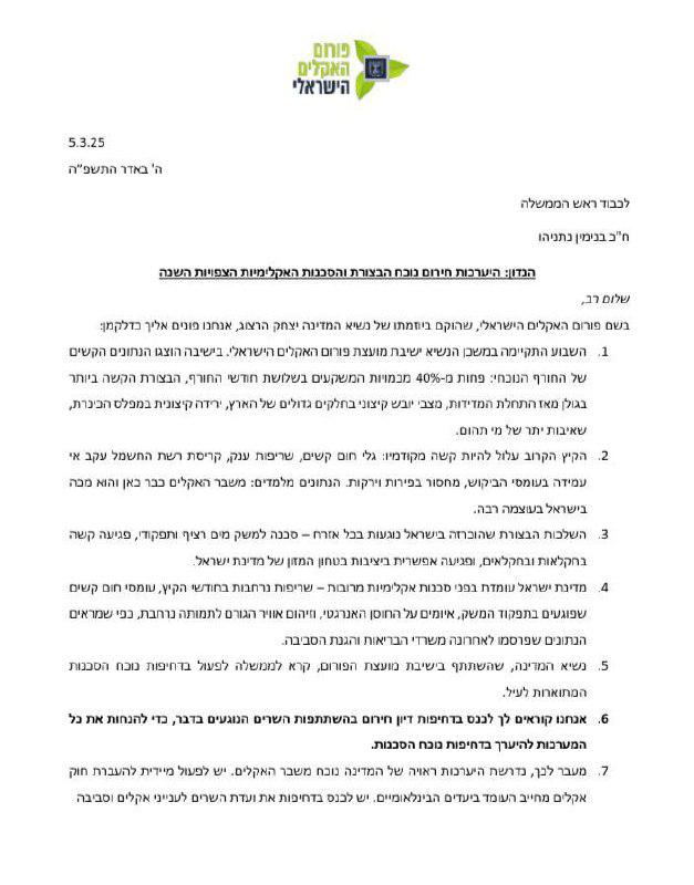 הפורום מתריע: הקיץ הקרוב עלול להיות קשה מקודמיו. המכתב שנשלח לרה"מ