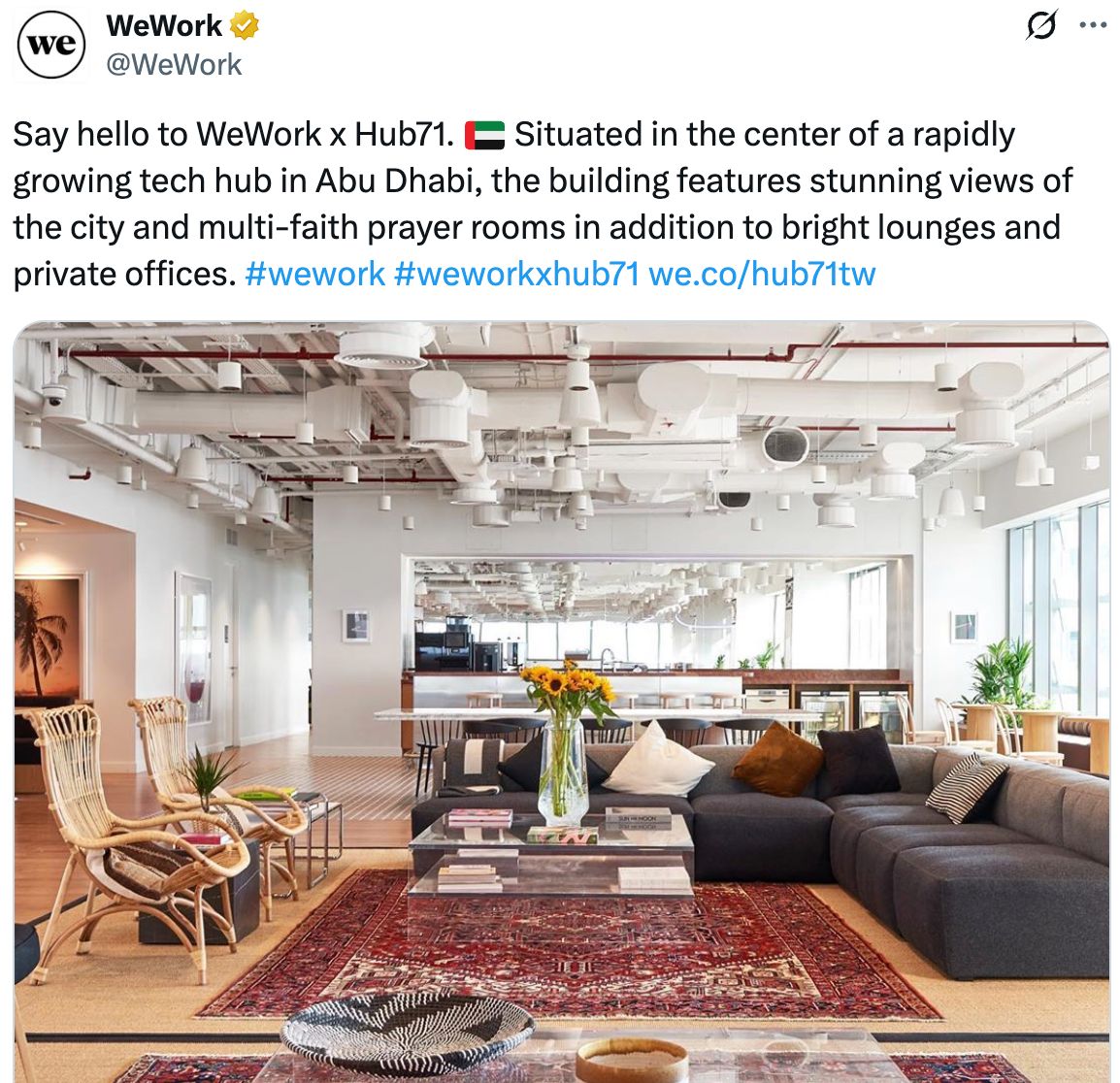שוכר אחר במתחם בירושלים צירף תמונת מסך מפרסום של wework באבו דאבי, שם מודגש דווקא כי ישנם חדרי תפילה. "אולי נעבור לאבו דאבי, ושם יהיה מותר לנו להתפלל" הוא אמר בסרקזם.