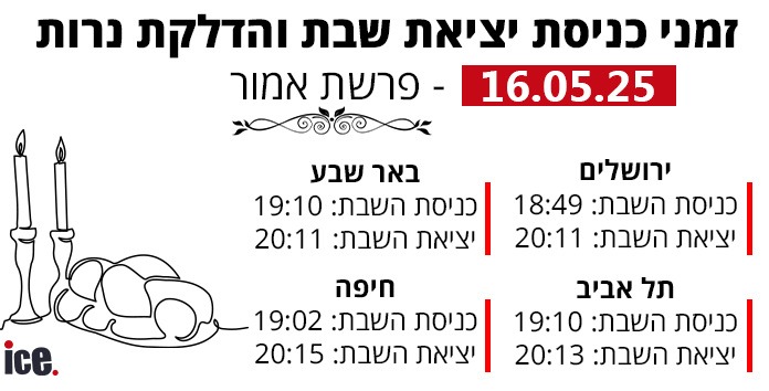 כמדי שבוע, ice מעדכן אתכם בזמני כניסת ויציאת שבת והדלקת נרות. והשבוע, פרשת השבוע "אמור" יום שישי של ה-16.5.2025 עד מוצאי שבת ב-17.5.2025. וגם: זהו מזג האוויר הצפוי לסוף השבוע