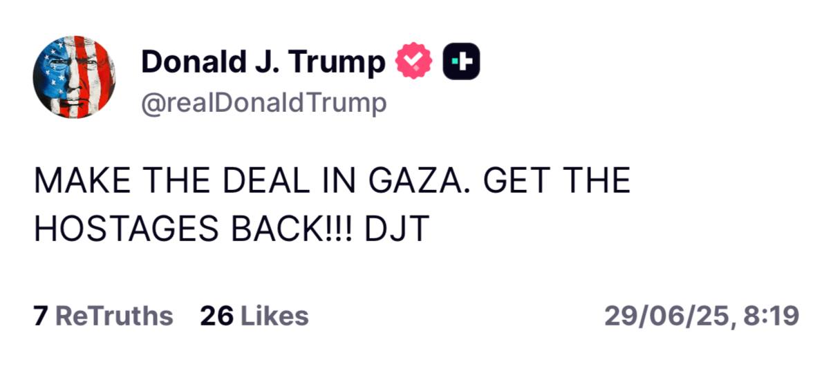 נשיא ארה"ב דונלד טראמפ פרסם הבוקר (ראשון) פוסט ברשת החברתית שלו Truth Social, בו קרא לשחרור מיידי של החטופים. בפוסט כתב הנשיא האמריקאי: "לסגור את העסקה בעזה. להחזיר את החטופים!".