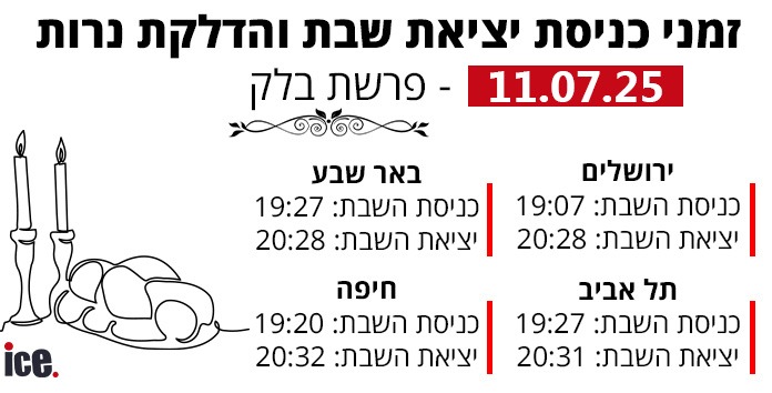 כמדי שבוע, ice מעדכן אתכם בזמני כניסת ויציאת שבת והדלקת נרות. והשבוע פרשת השבוע "בלק'' יום שישי של ה-11.7.2025 עד מוצאי שבת ב-12.7.2025. וגם: זהו מזג האוויר הצפוי לסוף השבוע