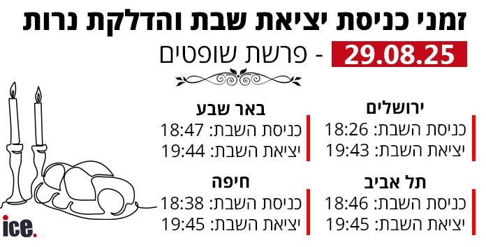 כמדי שבוע, ice מעדכן אתכם בזמני כניסת ויציאת שבת והדלקת נרות. והשבוע פרשת השבוע "שופטים'' יום שישי של ה-29.8.2025 עד מוצאי שבת ב-30.8.2025. וגם: זהו מזג האוויר הצפוי לסוף השבוע