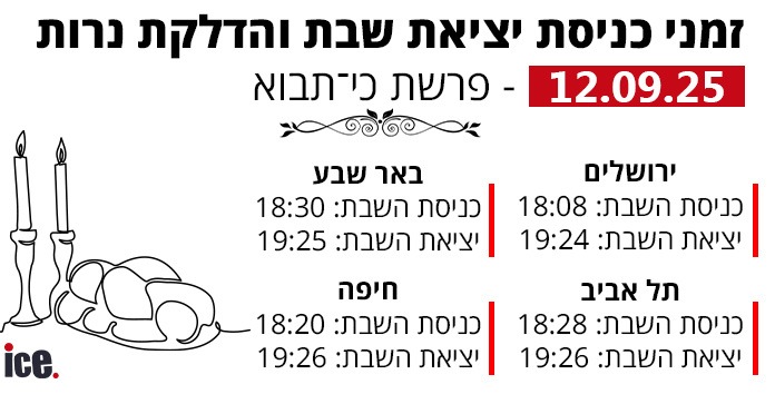 כמדי שבוע, ice מעדכן אתכם בזמני כניסת ויציאת שבת והדלקת נרות. והשבוע פרשת השבוע "כי תבוא' יום שישי של ה-12.9.2025 עד מוצאי שבת ב-13.9.2025. וגם: זהו מזג האוויר הצפוי לסוף השבוע