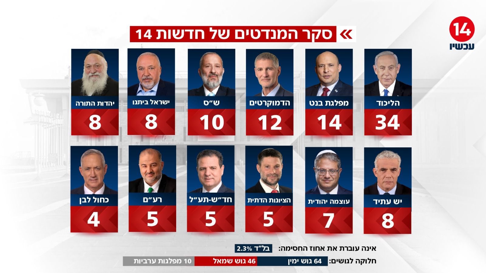 על פי תוצאות הסקר של חדשות 14 ששודר הערב במהדורה המרכזית בהנחיית מגי טביבי, ביחס לחלוקת הגושים ניתן להבחין כי גוש הימין מחזיק ב-64 מנדטים ואילו גוש השמאל מחזיק ב-46 מנדטים. המפלגות הערביות עם 10 מנדטים.