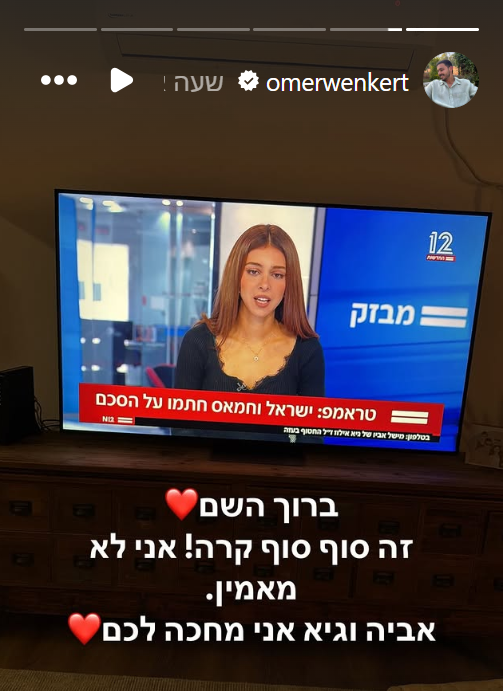 שורד השבי עומר ונקרט שיתף גם הוא בתחושותיו ברגע המכונן: “ברוך השם. זה סוף סוף קרה. אני לא מאמין”. ושלח בנוסף מסר לאביתר דוד וגיא גלבוע-דלאל, שהוחזקו איתו בשבי חמאס: “אביה וגיא, אני מחכים לכם”.