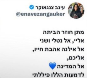 עינב צנגאוקר, אימו של מתן צנגאוקר, אחת ממובילות מחאת משפחות החטופים, פרסמה פוסט נרגש ברשת החברתית וכתבה: "מתן חוזר הביתה, אליי, אל נטלי ושני. אל אילנה אהבת חייו , אליכם, אל המדינה. לדמעות הללו פיללתי".
