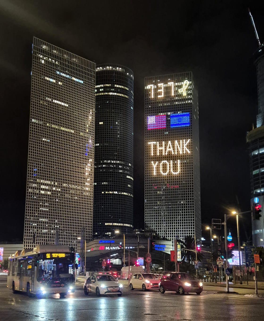 קבוצת עזריאלי מציינת את ההסכם ההיסטורי לשיבת החטופים ולסיום המלחמה במיצג אור מרגש על מגדלי עזריאלי בתל אביב, עם דגלי ישראל וארה"ב והכיתוב 'THANK YOU' כהוקרה לשותפות עם ארצות הברית ולחיילי צה"ל.