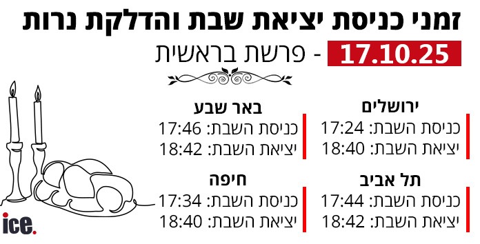 כמדי שבוע, ice מעדכן אתכם בזמני כניסת ויציאת שבת והדלקת נרות. והשבוע פרשת השבוע "בראשית' יום שישי של ה-17.10.2025 עד מוצאי שבת ב-18.10.2025. וגם: זהו מזג האוויר הצפוי לסוף השבוע?