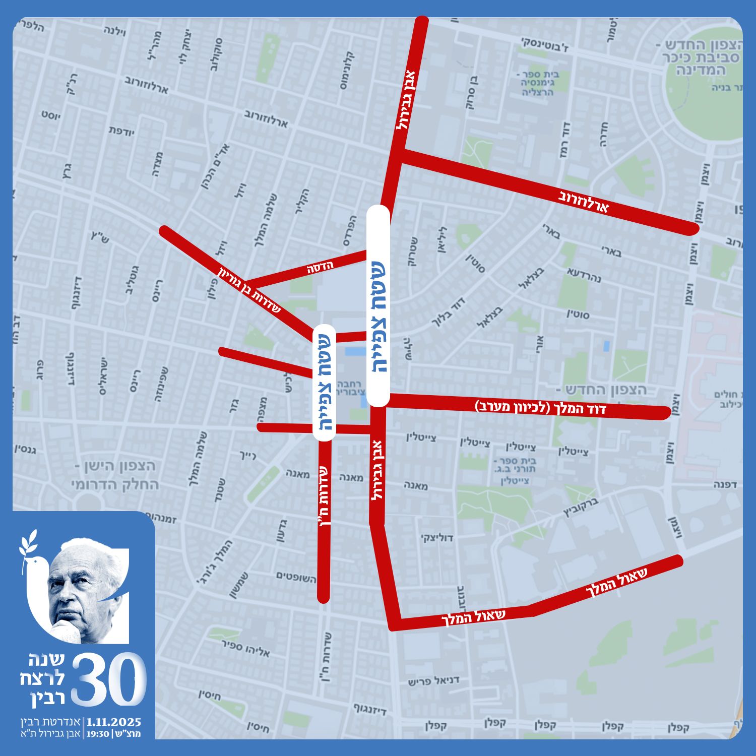 אחרי חמש שנים ללא עצרת, המונים צפויים להתכנס במוצאי שבת הקרוב, ה-1 בנובמבר 2025, בשעה 19:30, לציון 30 שנה לרצח ראש הממשלה יצחק רבין ז״ל. הבמה המרכזית תוצב סמוך לאנדרטת רבין ברחוב אבן גבירול, והקהל יעמוד לאורך הרחוב וברחובות הסמוכים.