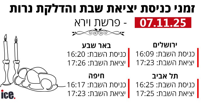 כמדי שבוע, ice מעדכן אתכם בזמני כניסת ויציאת שבת והדלקת נרות. והשבוע פרשת השבוע "וירא'' יום שישי של ה-7.11.2025 עד מוצאי שבת ב-8.11.2025. וגם: זהו מזג האוויר הצפוי לסוף השבוע?