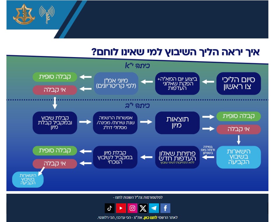 דובר צה"ל מודיע על שינוי שיטת השיבוץ למתגייסים החדשים. החל ממחזור הגיוס של אוגוסט 2026, תיכנס לתוקף הקדמת תהליך השיבוץ.