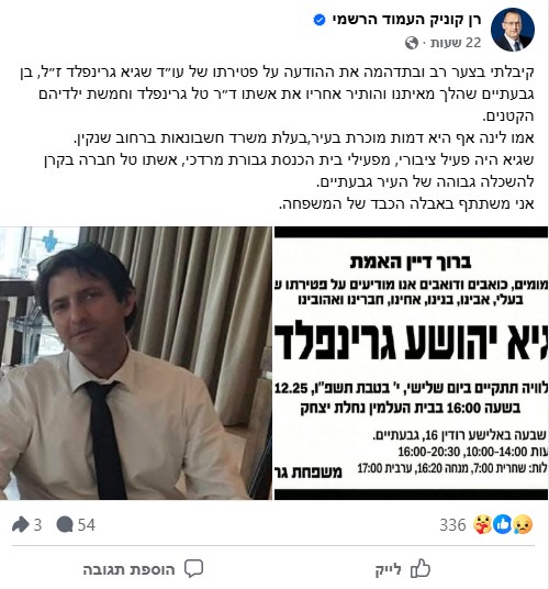 ראש העיר רן קוניק, העלה פוסט לחשבון הפייסבוק שלו, אליו צירף את מודעת האבל על לכתו של גרינפלד ז"ל, צירף את תמונה וכתב ברקע: "קיבלתי בצער רב ובתדהמה את ההודעה על פטירתו של עו״ד שגיא גרינפלד ז״ל, בן גבעתיים שהלך מאיתנו והותיר אחריו את אשתו ד״ר טל גרינפלד וחמשת ילדיהם הקטנים".