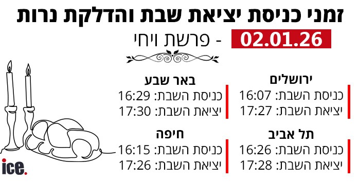 כמדי שבוע, ice מעדכן אתכם בזמני כניסת ויציאת שבת והדלקת נרות. והשבוע פרשת השבוע "ויחי'' יום שישי של ה-2.1.2026 עד מוצאי שבת ב-3.1.2026