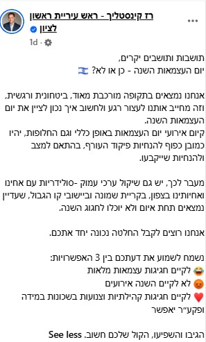 קינסטליך פנה אל התושבים שיכתבו לו בתגובות מה דעתם לגבי קיום אירועי יום העצמאות: "אנחנו רוצים לקבל החלטה נכונה יחד אתכם. נשמח לשמוע את דעתכם בין 3 האפשרויות - אימוג'י צוחק = לקיים חגיגות עצמאות מלאות, אימוג'י כועס = לא לקיים השנה אירועים ואימוג'י לב = לקיים חגיגות קהילתיות וצנעות בשכונות במדינה ופיקוד העורף יאפשר. הגיבו והשפיעו, הקול שלכם חשוב".