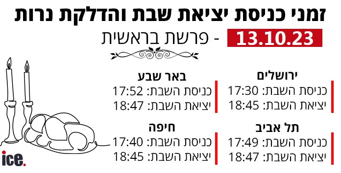 על רקע מלחמת 'חרבות ברזל', רגע לפני שהשבת נכנסת, ice עושה לכם סדר, כמדי שבוע, בזמני כניסת ויציאת שבת והדלקת נרות. והשבוע, "בראשית" ליום שבת של ה-13.10.2023 עד מוצאי שבת ב-14.10.2023 וגם: מה מזג האוויר הצפוי לסוף השבוע?