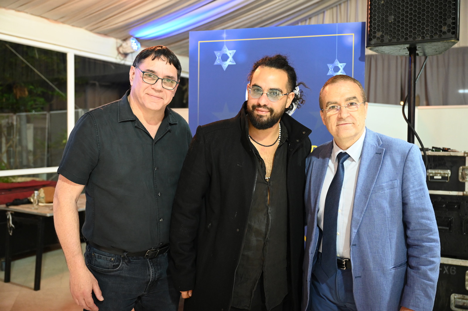 בתמונה מימין לשמאל: דימיטר טזאנצב (שגריר האיחוד האירופי בישראל), הזמר בניה ברבי, אמיר גיסין (מנכ"ל מכבי תנועה עולמית), צילום: מורג ביטן