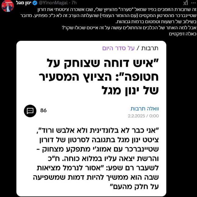 מגיש תוכנית הפטריוטים בערוץ 14, ינון מגל, לא מתכוון לוותר כל כך בקלות לאלו שכתבו נגדו, במסגרת הסערה החדשה סביבו שחורכת את הרשת. ציוץ אחד שלו בו הוא ציטט את דברים של החטופה ששבה הביתה, דורון שטיינברכר, הביא רבים לצאת נגדו בחריפות.