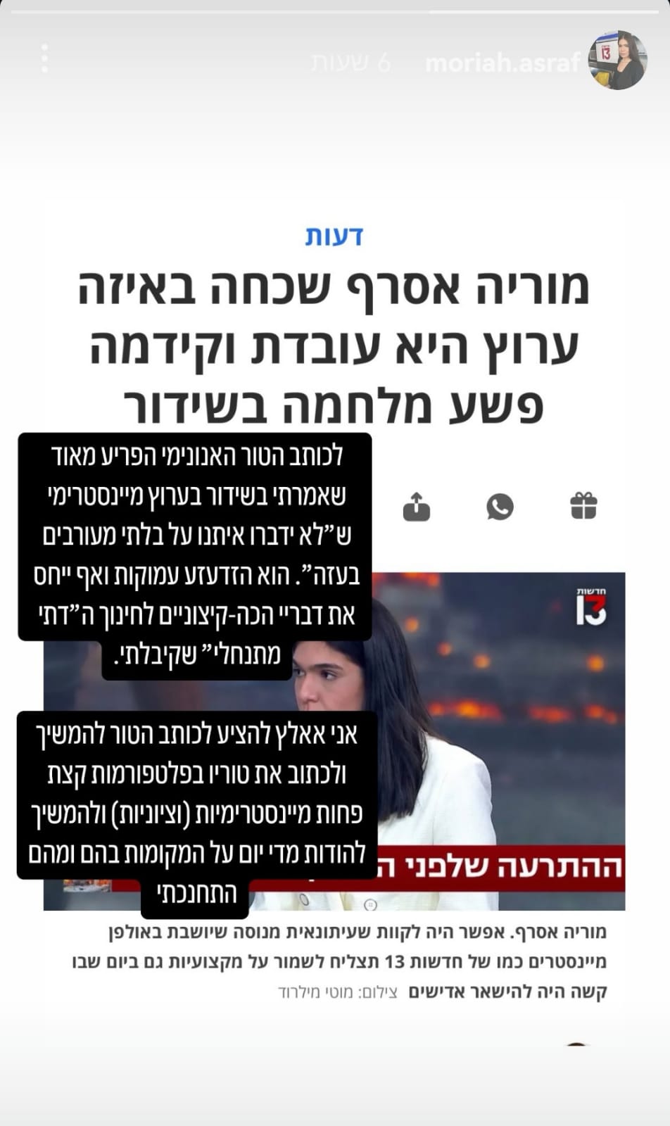 טור בעיתון הארץ שהאשים את הכתבת המדינית של ערוץ 13, מוריה אסרף, בנרמול פשעים נגד האנושות הצליח להרתיח את העיתונאית. מה היא הציעה לכותב לעשות?