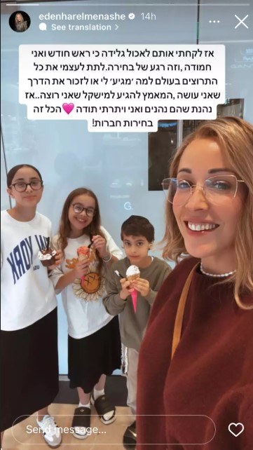 בסטורי שהעלתה כתבה מגישת הטלוויזיה בתוספת תמונה שלה ושל ילדיה המתוקים: "אז לקחתי אותם לאכול גלידה כי ראש חודש ואני חמודה, וזה רגע של בחירה. לתת לעצי את כל התירוצים בעולם למה 'מגיע' לי או לזכור את הדרך שאני עושה, המאמץ להגיע למשקל שאני רוצה".