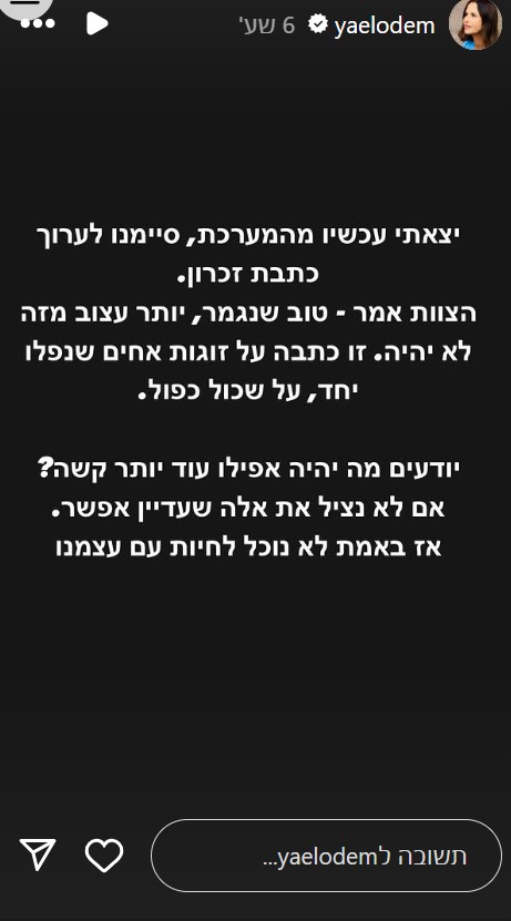 "יצאתי עכשיו מהמערכת, סיימנו לערוך כתבת זיכרון. הצוות אמר - טוב שנגמר, יותר עצוב מזה לא יהיה. זו כתבה על זוגות אחים שנפלו יחד, על שכול כפול", סיפרה יעל אודם. בהמשך, פנתה כתבת חדשות 12 לעוקביה ושיתפה בתרחיש שמדאיג אומה שלמה: "יודעים מה יהיה אפילו עוד יותר קשה? אם לא נציל את אלה שעדיין אפשר. אז באמת לא נוכל לחיות עם עצמנו".