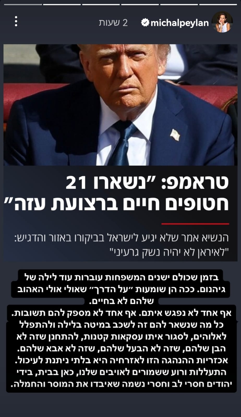 כתבת הרווחה של חדשות 12, מיכל פעילן, התייחסה הלילה להודעה המטלטלת של נשיא ארה"ב, דונלד טראמפ שטען באגביות כי 3 חטופים מתו בשבי חמאס. להודעה אין אישור ישראלי רשמי