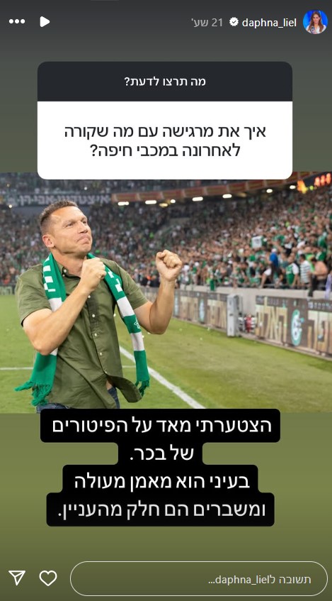 כזכור, לאחר תוצאות מאכזבות במיוחד מתחילת העונה, החליט הבעלים והנשיא של קבוצת הכדורגל מכבי חיפה להיפרד מהמאמן המיתולוגי, ברק בכר. הפרשנית הפוליטית והמגישה של חברת החדשות בקשת 12, השיבה לשאלה של אחד העוקבים באינסטגרם בנושא וכתבה: "הצטערתי מאוד על הפיטורים של בכר. בעיניי, הוא מאמן מעולה ומשברים הם חלק מהעניין".