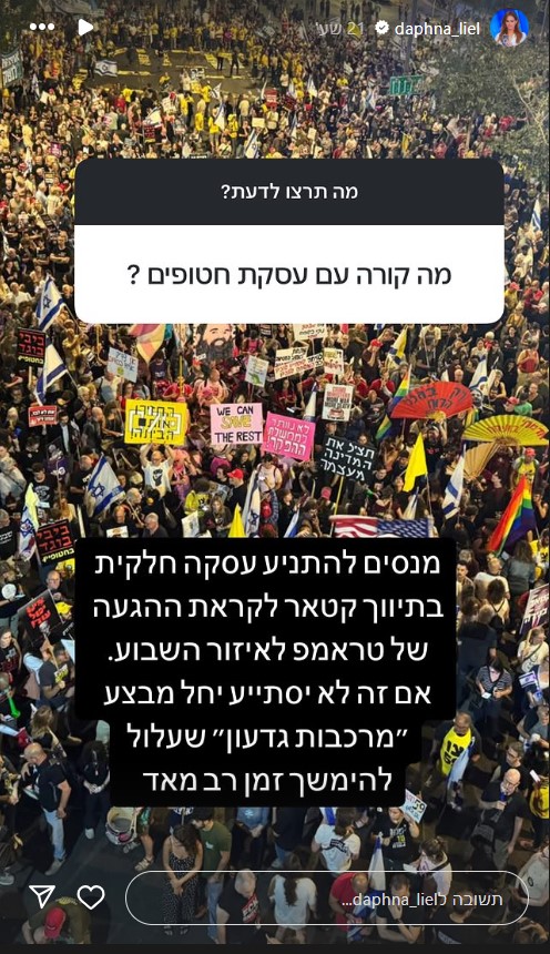 דפנה ליאל, אשר משמשת כפרשנית פוליטית ומגישה מחליפה בחדשות 12, קיימה שיח נרחב עם העוקבים שלה ברשת החברתית אינסטגרם. בין היתר, התייחסה דפנה ליאל לעיכוב שחל במשא ומתן בנוגע לעסקת החטופים.