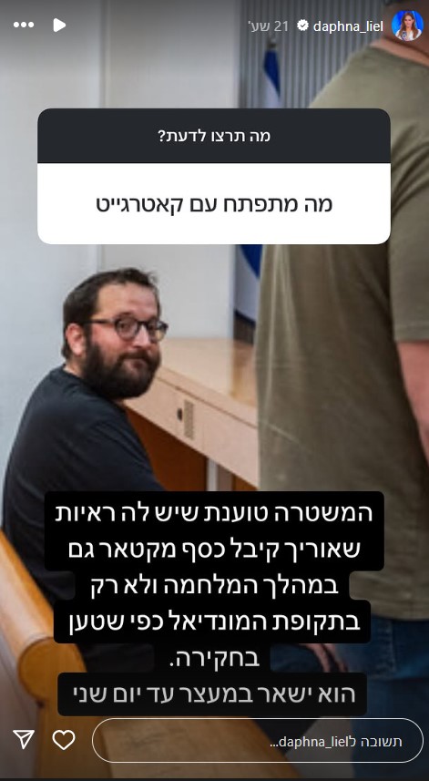 באשר לפרשת קטאר-גייט המתפתחת, ציינה הפרשנית הפוליטית של חברת החדשות כי המשטרה טוענת שיש לה ראיות שאוריך, יועצו של ראש הממשלה, קיבל כסף מקטאר גם במהלך המלחמה ולא רק בתקופת המונדיאל כפי שטען בחקירה. "הוא יישאר במעצר עד יום שני", הודיעה דפנה ליאל.