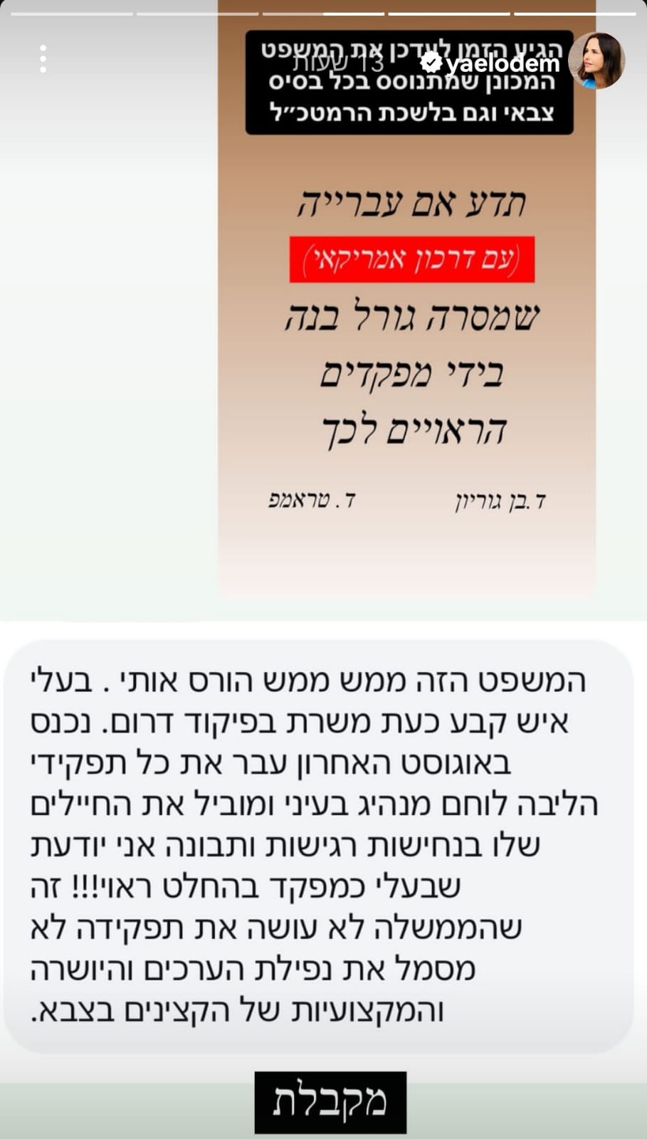 "המשפט הזה ממש ממש הורס אותי", כתבה העוקבת. "בעלי איש קבע, כעת משרת בפיקוד דרום. נכנס באוגוסט האחרון, עבר את כל תפקידי הליבה. לוחם, מנהיג בעיני, ומוביל את החיילים שלו בנחישות, רגישות ותבונה. אני יודעת שבעלי כמפקד בהחלט ראוי!!! זה שהממשלה לא עושה את תפקידה לא מסמל את נפילת הערכים והיושרה והמקצועיות של הקצינים בצבא".