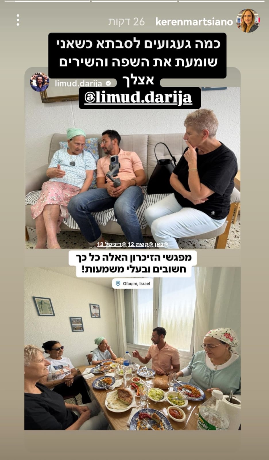 מגישת חדשות 12, קרן מרציאנו שיתפה אמש סטורי של יונה אלפסי, מורה לשפה המרוקאית שתיעד מפגש עם הסבתא המרוקאית יקוט, באופקים. "עוד מפגש שממלא את הנשמה", כתב אלפסי על גבי הסרטון שמתעד אותו שר ומשוחח במרוקאית עם הסבתא המבוגרת במה שהוא מגדיר "מפגשי זיכרון חשובים ובעלי משמעות".