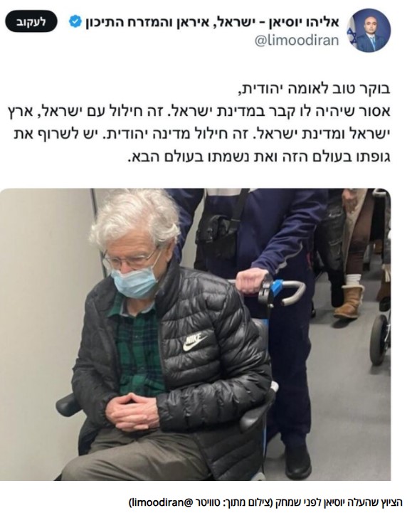 כאמור, מוקדם יותר היום (שלישי) פרסם המזרחן אליהו יוסיאן ציוץ ברשת החברתית X, הכולל את תמונתו של אהרון ברק, נשיא בית המשפט העליון לשעבר. לצד התמונה שהציג, כתב יוסיאן: "בוקר טוב לאומה יהודית, אסור שיהיה לו קבר במדינת ישראל. זה חילול עם ישראל, ארץ ישראל ומדינת ישראל.
