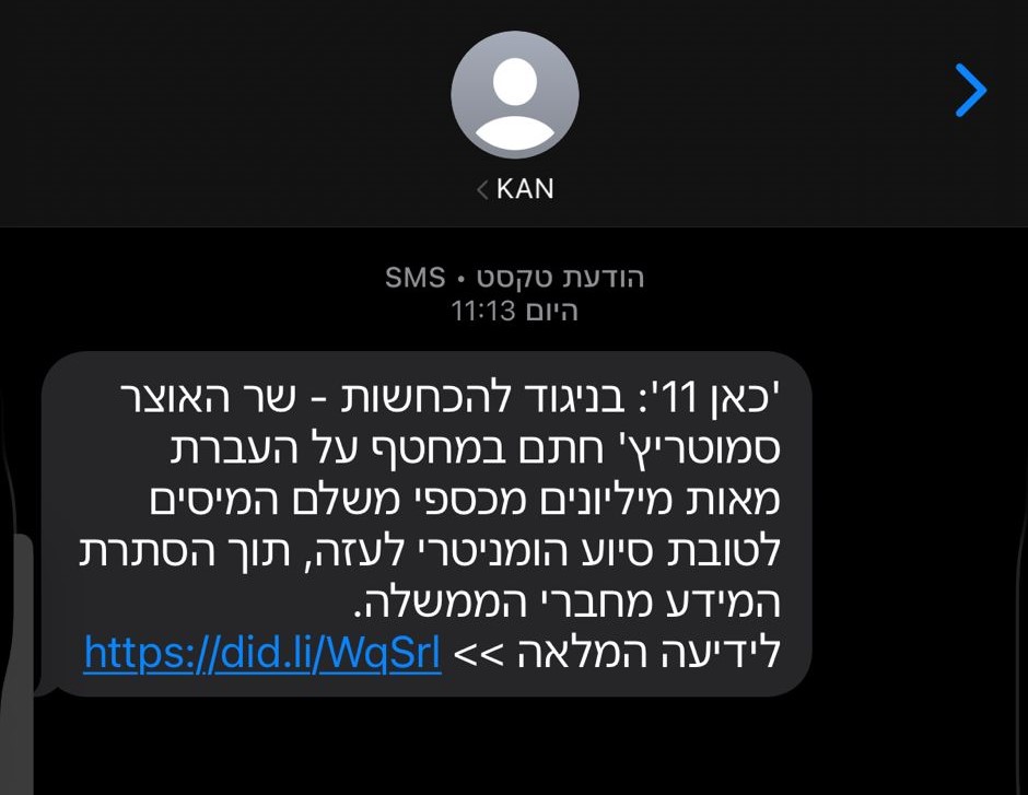 הודעת טקסט המתחזה להודעה מטעם התאגיד תחת הכותרת "כאן 11" מופצת לאזרחי ישראל. מטעם הערוץ נמסר: "מדובר בקישור זדוני ובהודעה מזויפת"