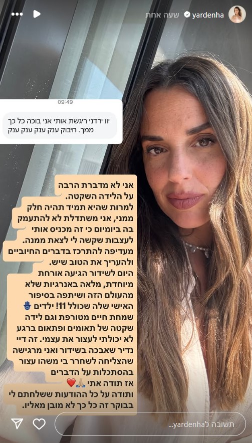 בהמשך, סיפרה מגישת ערוץ 13 על בת ה-46 שהביאה לעולם 11 ילדים, אשר חוויותיה האישיות מחדר הלידה, הזכירו לה את שלה: "היום לשידור, הגיעה אורחת מיוחדת, מלאה באנרגיות שלא מהעולם הזה ושיתפה בסיפור האישי שלה שכולל 11 ילדים, שמחת חיים מטורפת וגם לידה שקטה של תאומים ופתאום ברגע לא יכולתי לעצור את עצמי.