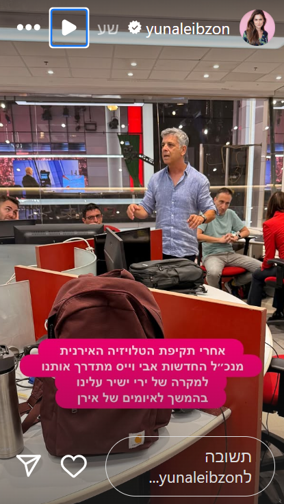 העיתונאית תיעדה את מנכ"ל חברת החדשות אבי וייס במהלך תדרוך שביצע לעובדים וכתבה: "אחרי תקיפת הטלוויזיה האיראנית, מנכ"ל החדשות אבי וייס מתדרך אותנו למקרה של ירי ישיר עלינו בהמשך לאיומים של איראן".