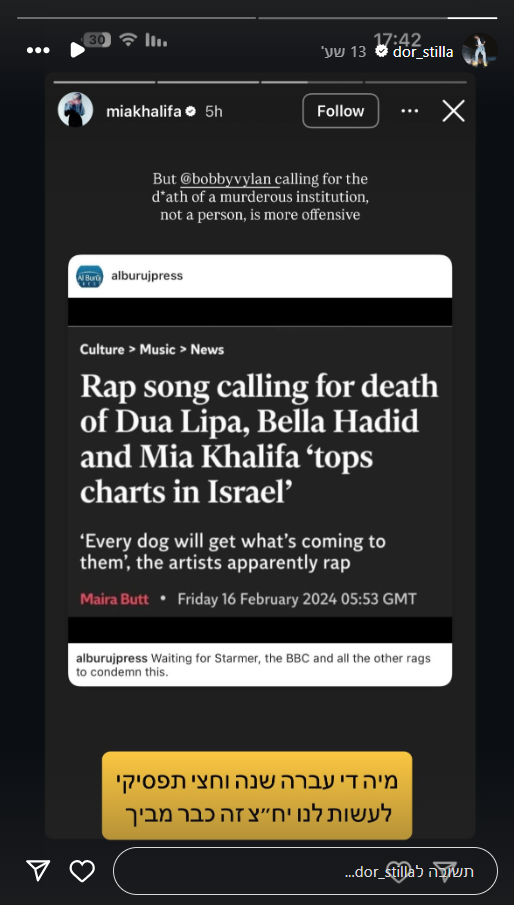 בסטורי שהעלתה רשמה קאליפה: "אבל בוב וילן קראו למוות של מוסד רצחני, לא של אדם, זה יותר פוגעני", והזכירה את המקרה שלה. הראפר דור סורוקר (סטילה), לא נשאר אדיש ותקף בחזרה: "מיה די עברה שנה וחצי תפסיקי לעשות לנו יח"צ זה מביך".