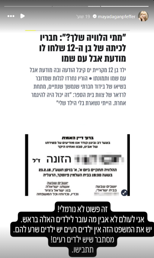 השחקנית הישראלית מתייחסת לסיפור על הילד בן ה-12 שעבר חרם ממושך. בשיא החרם, הילד קיבל מודעת אבל מפוברקת אודותיו. "זה פשוט לא נורמלי, לעולם לא אבין מה עובר להם בראש"
