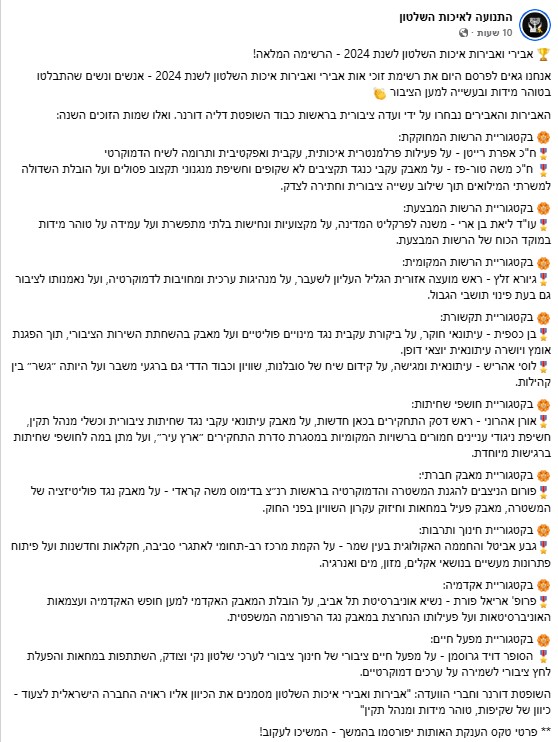התנועה לאיכות השלטון פרסמה היום (שני) את הרשימה המלאה של אבירי ואבירות איכות השלטון לשנת 2024. בין השמות הבולטים, ניתן למנות את ח"כ אפרת רייטן, עו"ד ליאת בן ארי, העיתונאים בן כספית, לוסי אהריש, אורן אהרוני והסופר דויד גרוסמן.