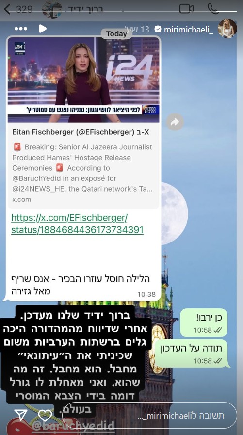 מירי מיכאלי, מגישת מהדורת החדשות המרכזית של i24NEWS, חשפה אמש כי דברים שאמרה במהלך השידור כנגד עיתונאי אל ג'זירה עוררו עניין ברשתות הערביות: "מאחלת לו גורל דומה בידי הצבא המוסרי בעולם"
