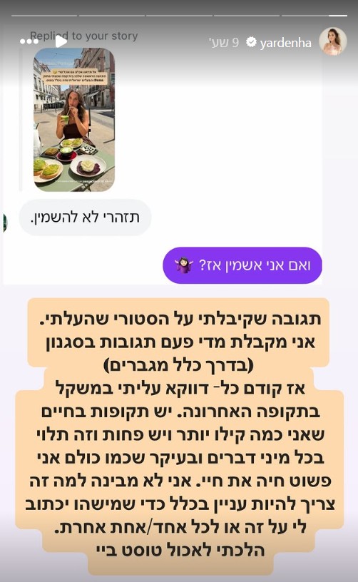 "תגובה שקיבלתי על הסטורי שהעליתי. אני מקבלת מדי פעם תגובות בסגנון (בדרך כלל מגברים). אז קודם כל, דווקא עליתי במשקל בתקופה האחרונה. יש תקופות בחיים שאני כמה קילו יותר ויש פחות וזה תלוי בכל מיני דברים ובעיקר שכמו כולם אני פשוט חיה את חיי. אני לא מבינה למה זה צריך להיות עניין בכלל כדי שמישהו יכתוב לי על זה או לכל אחד/אחת אחרת. הלכתי לאכול טוסט. ביי", סיכמה המגישה.