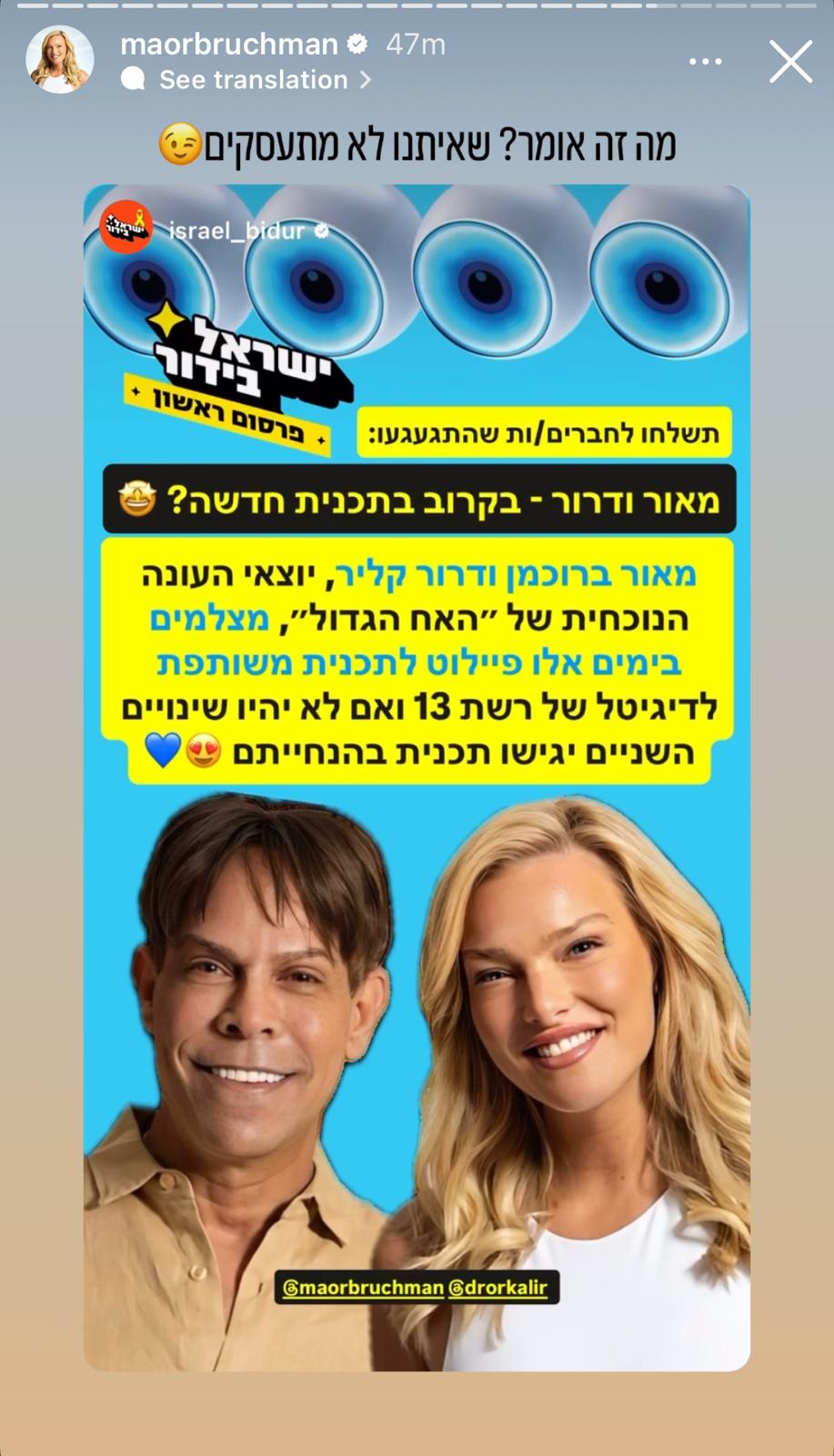 במידה ולא יתקיימו שינויים מהותיים, פליטי "האח הגדול" יגישו את התוכנית המדוברת. מאור ברוכמן שיתפה את הפרסום בחשבון האינסטגרם שלה וציינה בהומור: "מה זה אומר? שאיתנו לא מתעסקים".