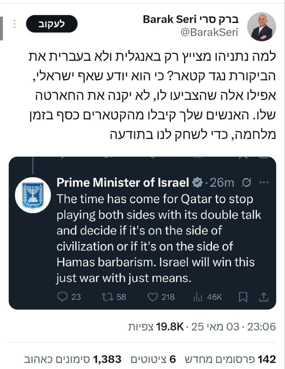 ינון מגל שיתף ציוץ ישן שפרסם ברק סרי ברשת X, בו העיתונאי יצא נגד נתניהו: "למה נתניהו מצייץ רק באנגלית ולא בעברית את הביקורת נגד קטאר? כי הוא יודע שאף ישראלי, אפילו אלה שהצביעו לו, לא יקנה את החארטה שלו". בנוסף, דאג ינון מגל לשלוח עקיצה לעיתונאי