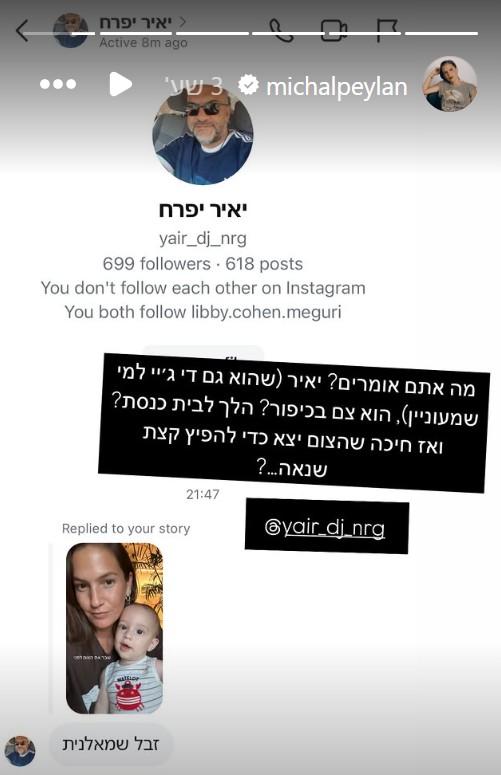 "מה אתם אומרים?", כתבה פעילן על רקע צילום המסך של ההודעה, "יאיר, (שהוא גם די ג'יי למי שמעוניין), הוא צם בכיפור? הלך לבית כנסת? ואז חיכה שהצום יצא כדי להפיץ קצת שנאה?".