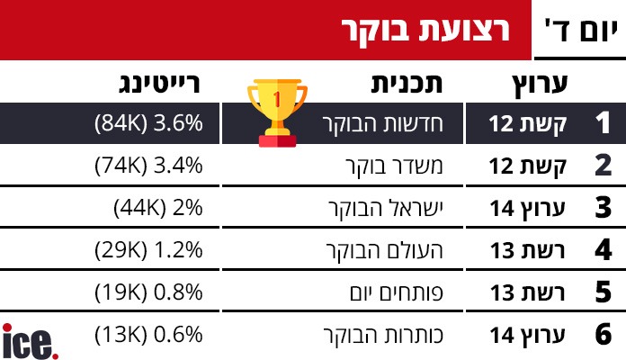 בין מהדורות החדשות, המנצחת הייתה כמו תמיד זו של ערוץ 12, כאשר יונית לוי משכה 14.1% רייטינג (368 אלף צופים). מגי טביבי וחדשות 14 גרפו 7% רייטינג (182 אלף צופים). אודי סגל וחדשות 13 עם 5.3% רייטינג (139 אלף צופים).