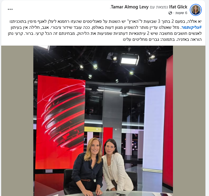 העיתונאית ומגישת כאן 11, יפעת גליק, מצאה את עצמה פעמיים תחת הביקורת של עיתון הארץ תוך שבועיים, בכל הקשור לתוכניתה בשישי בערב יחד עם תמר אלמוג, והפעם החליטה לשבור שתיקה ולהחזיר אש: "חלילה אין בעיתון לאנשים חושבים מחשבה שיש שתי עיתונאיות דעתניות שמניעות את הליהוק"